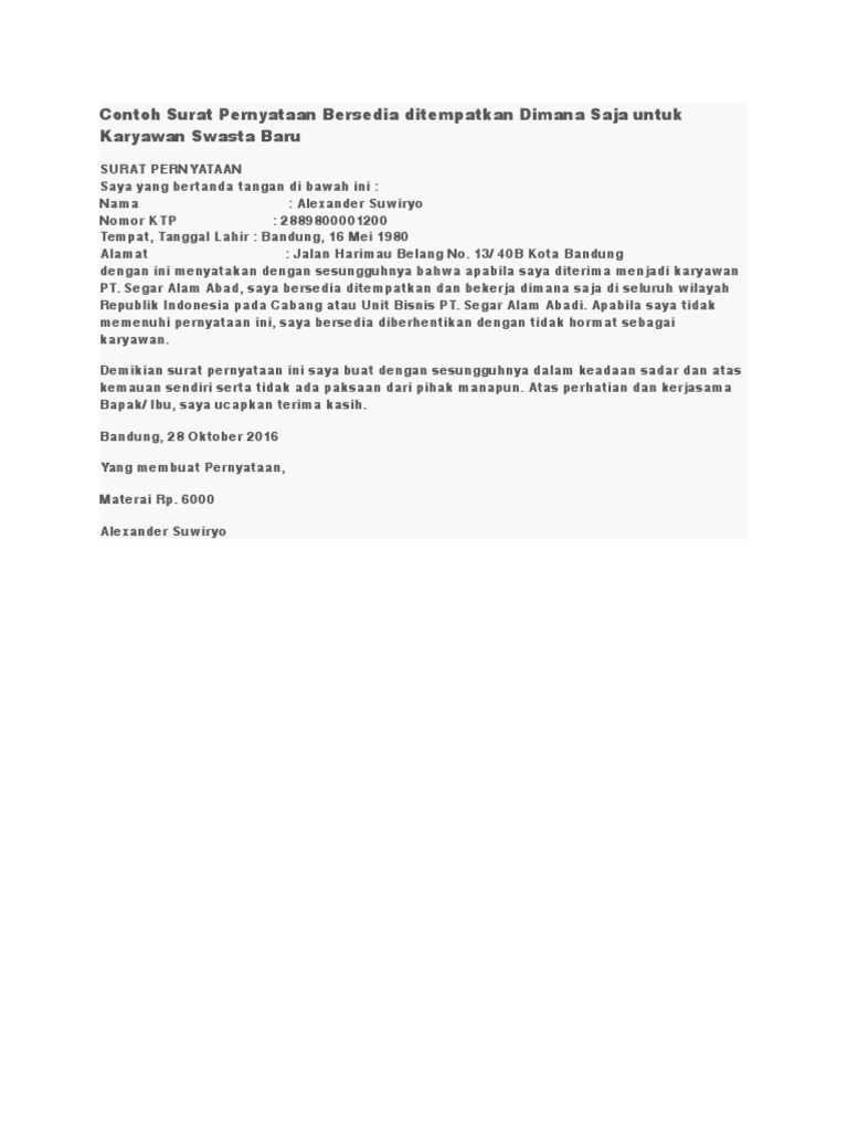 Contoh surat pernyataan kerja adalah sebuah surat mengenai kesanggupan seorang karyawan untuk bekerja dalam kondisi tertentu. Download as doc, pdf, txt or read online from scribd. Savesave surat pernyataan bersedia ditempatkan dimana saja for later. Caranya adalah dengan membuat surat pernyataan kehilangan. 0%(1)0% found this document useful (1 vote). Namun ada kalanya pernyataan yang akan diberikan harus dengan menggunakan surat, baik itu menyatakan diri sendiri ataupun menyatakan tentang orang lain. Namun untuk urusan komunikasi perusahaan maupun berbagai lembaga maupun instansi pemerintah, penggunaan surat masih merupakan sesuatu hal yang wajib. Dengan ini menyatakan bahwa saya bersedia ditempatkan dimana saja di unit kegiatan lingkungan. Demikian pernyataan ini saya buat dengan sesungguhnya, dan saya bersedia dituntut dimuka pengadilan serta bersedia menerima segala tindakan yang diambil oleh pemerintah. Di seluruh unit kerja surat_pernyataan_bersedia penempatan dimana saja_cpns kementan 2018. Surat pernyataan siap ditempatkan berikut ini anda bisa lansung copypaste contoh pernyataan siap ditempatkan. Surat pernyataan merupakan salah satu surat yang umum digunakan untuk berbagai macam hal. Selain itu, ada juga pengertian lain.